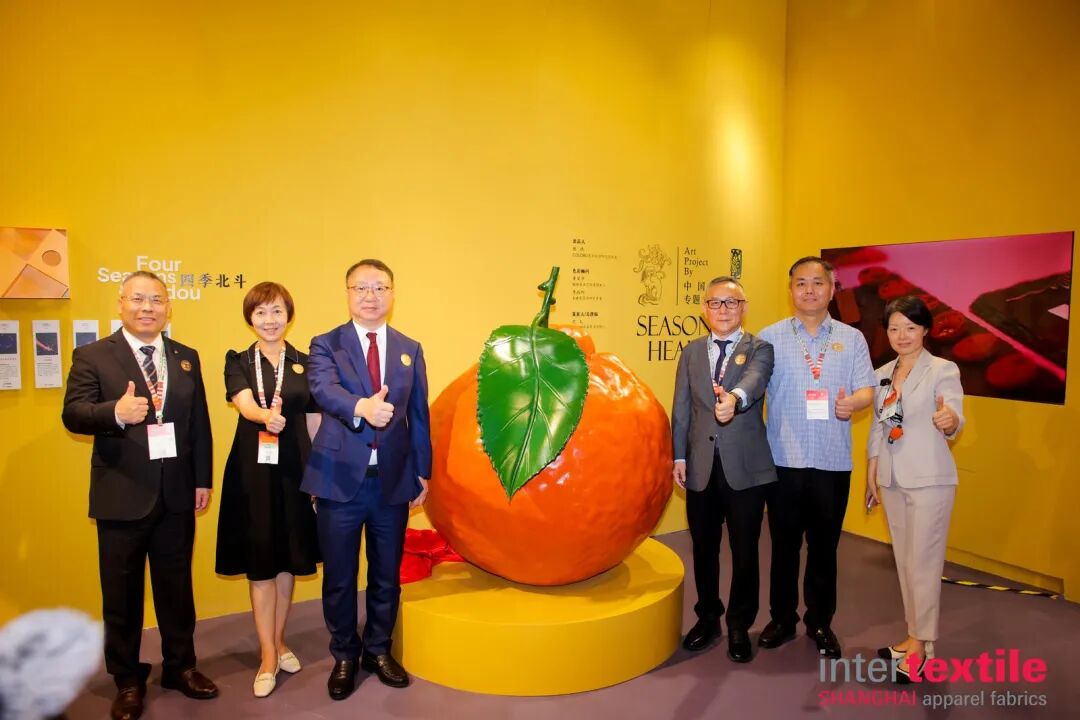 展会首日,“橙黄橘绿时——中国传统色专题文化艺术展”全新亮相,以传统色彩为切入点,用科学编码解读千年美色,激活传统色的现代生命力,探索传统文化与现代纺织的融合路径。展位摆放的“大橘子”一经亮相便吸引无数观众打卡拍照。